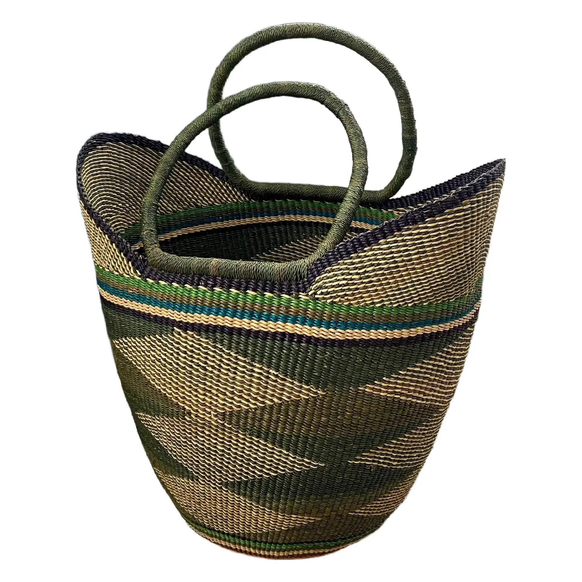 Large hand woven Bolga shopping basket. Made from elephant grass, featuring a natural and dark green geometric pattern and twin handles.